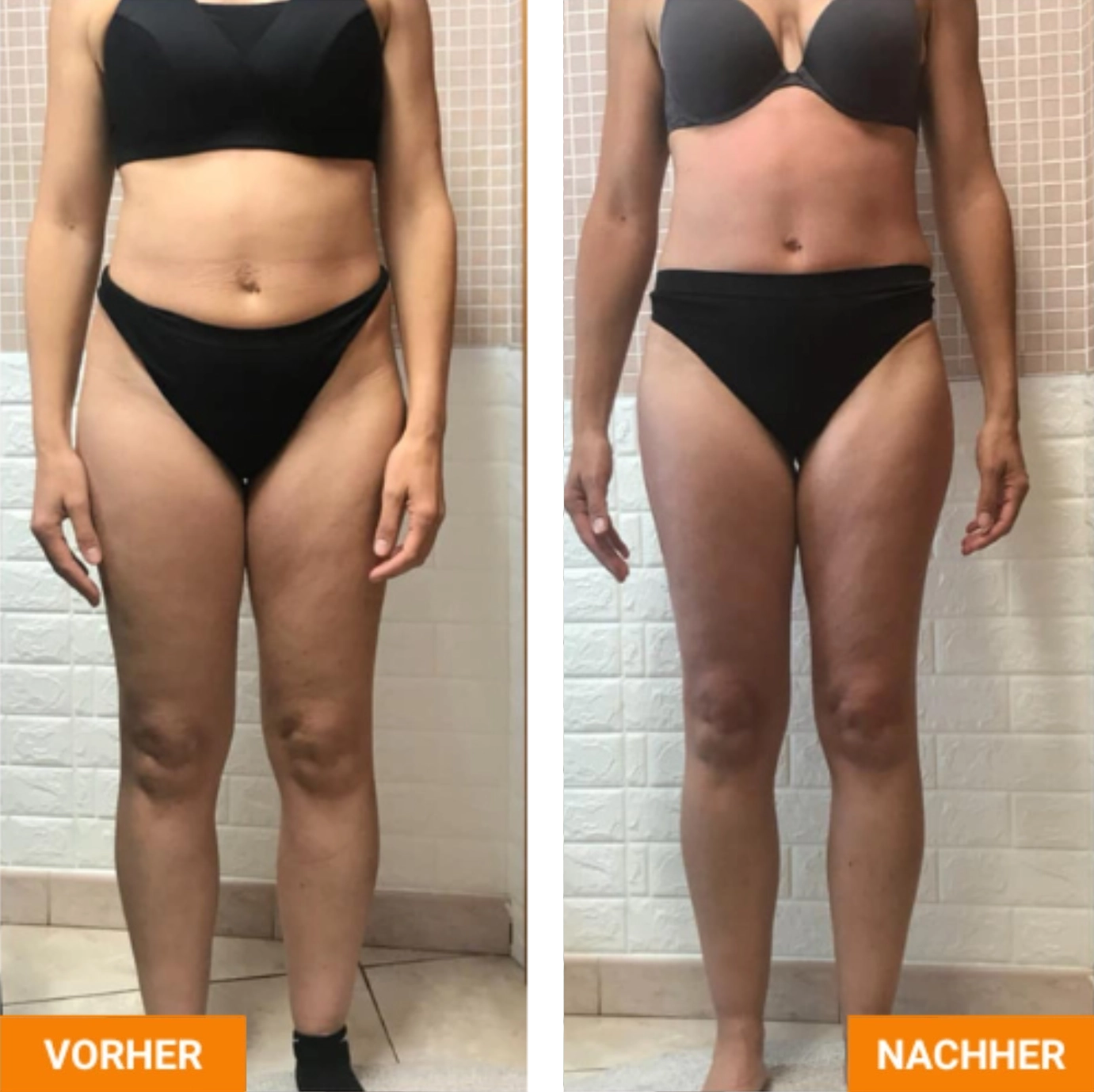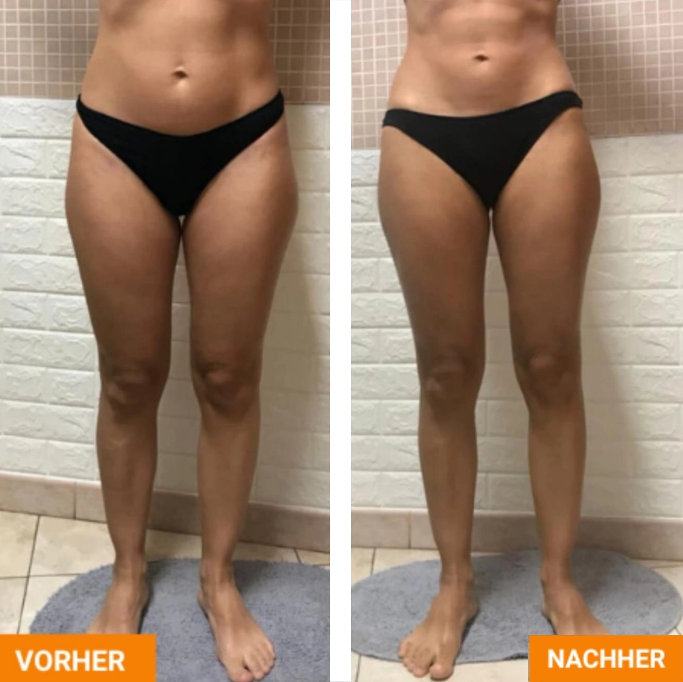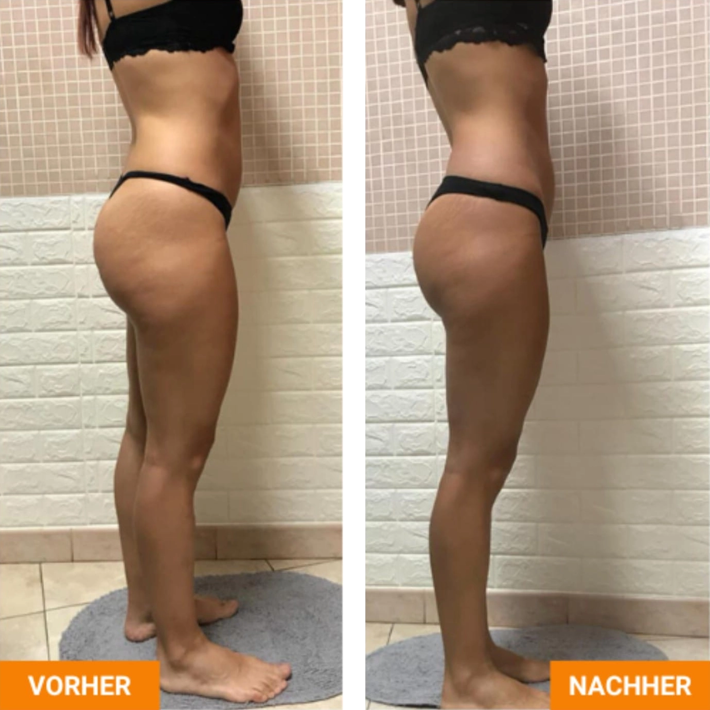 Die Vorher-Nachher-Darstellungen zeigen mögliche körperliche Veränderungen im Verlauf regelmäßiger Rollshape-Behandlungen. Durch die Kombination aus mechanischer Stimulation, Wärme- und Lichtimpulsen können Prozesse wie Lymphaktivierung, Gewebeentlastung und Hautbildverbesserung individuell unterstützt werden. Ergebnisse sind stets persönlich und abhängig von Ausgangssituation und Behandlungsdauer.