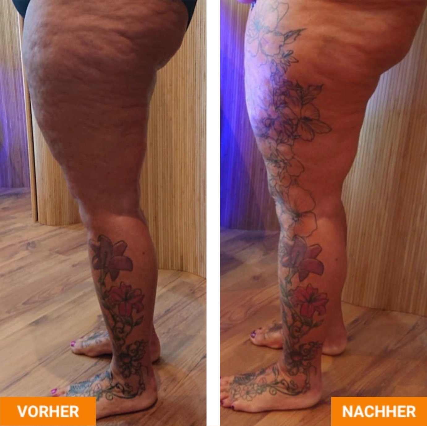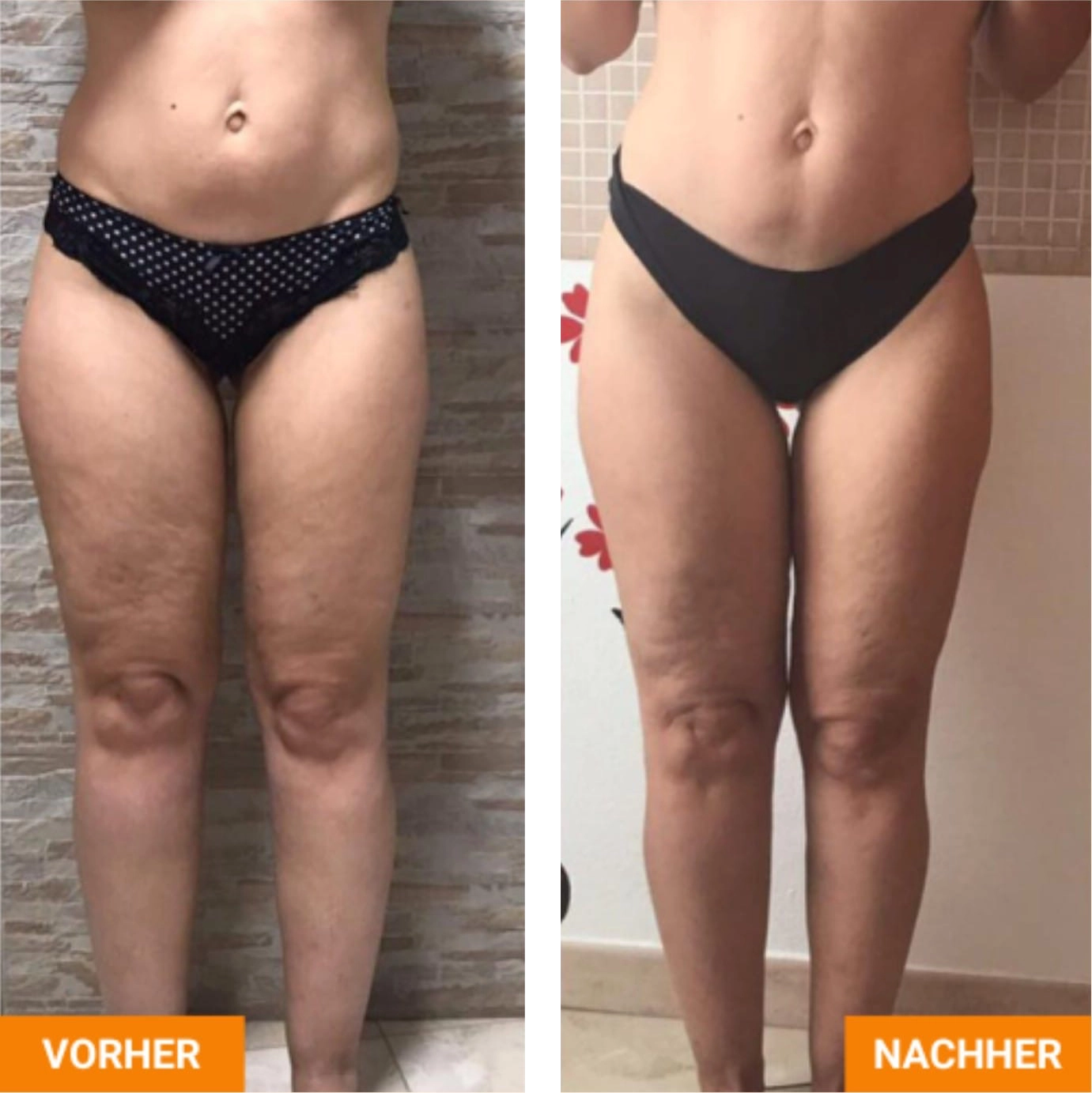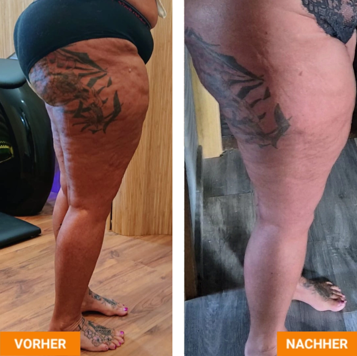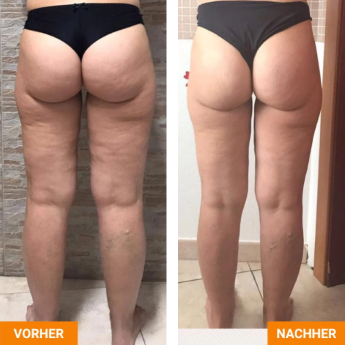 Die Vorher-Nachher-Darstellungen zeigen mögliche körperliche Veränderungen im Verlauf regelmäßiger Rollshape-Behandlungen. Durch die Kombination aus mechanischer Stimulation, Wärme- und Lichtimpulsen können Prozesse wie Lymphaktivierung, Gewebeentlastung und Hautbildverbesserung individuell unterstützt werden. Ergebnisse sind stets persönlich und abhängig von Ausgangssituation und Behandlungsdauer.